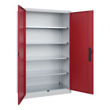 Schwerlastschrank Acurado, Korpus aus stabiler Stahlkonstruktion mit hochwertiger Einbrennbeschichtung für hohe UV-Beständigkeit. Mit Bodengleitern als praktischem Schrank- und Fußbodenschutz. Hohe Flexibilität der Inneneinrichtung durch Höhenverstellbarkeit im Raster. Türen mit geschlossenen Seitenprofilen und verdeckten Schließstangen für höchste Stabilität und Einbruchsicherheit, mit Soft-Anschlag, Türaufhängung in außen liegenden Scharnieren mit großzügigem Öffnungswinkel. Türen zueinander schlagend für gemeinsamen Verschluss. 3-Riegeliges Ergo-Lock Griffschloss für optimale Bedienungssicherheit und Verschleißfestigkeit mit patentiertem Mechanismus: Zum Schließen einfach zudrücken. Achtung: Anlieferungsmöglichkeit durch Sattelschlepper muss gegeben sein.