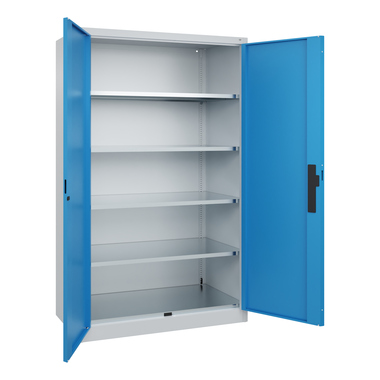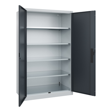 Schwerlastschrank Acurado, Korpus aus stabiler Stahlkonstruktion mit hochwertiger Einbrennbeschichtung für hohe UV-Beständigkeit. Mit Bodengleitern als praktischem Schrank- und Fußbodenschutz. Hohe Flexibilität der Inneneinrichtung durch Höhenverstellbarkeit im Raster. Türen mit geschlossenen Seitenprofilen und verdeckten Schließstangen für höchste Stabilität und Einbruchsicherheit, mit Soft-Anschlag, Türaufhängung in außen liegenden Scharnieren mit großzügigem Öffnungswinkel. Türen zueinander schlagend für gemeinsamen Verschluss. 3-Riegeliges Ergo-Lock Griffschloss für optimale Bedienungssicherheit und Verschleißfestigkeit mit patentiertem Mechanismus: Zum Schließen einfach zudrücken. Achtung: Anlieferungsmöglichkeit durch Sattelschlepper muss gegeben sein.