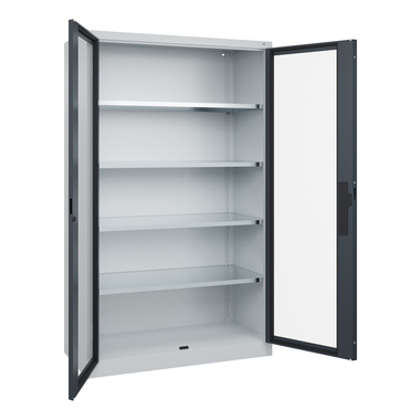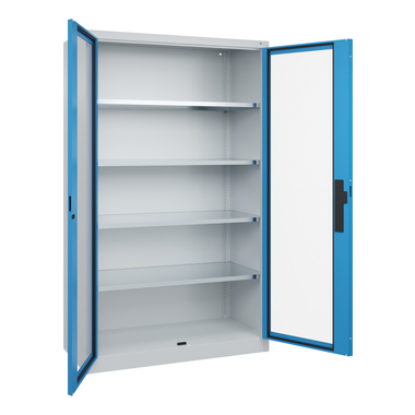 Werkzeugschrank Acurado. Korpus aus stabiler Stahlkonstruktion mit hochwertiger Einbrennbeschichtung für hohe UV-Beständigkeit. Mit Bodengleitern als praktischer Schrank- und Fußbodenschutz. Hohe Flexibilität der Inneneinrichtung durch Höhenverstellbarkeit im Raster. Türen mit Sichtfenster aus Acrylglas für direkten Einblick. Türen zueinander schlagend für gemeinsamen Verschluss. Geschlossene Seitenprofile und verdeckte Schließstangen für höchste Stabilität und Einbruchsicherheit, mit Softanschlag. Türaufhängung in außen liegenden Scharnieren mit großzügigem Öffnungswinkel. 3-Riegeliges Ergo-Lock Griffschloss für optimale Bedienungssicherheit und Verschleißfestigkeit mit patentiertem Mechanismus: Zum Schließen einfach zudrücken. Achtung: Anlieferungsmöglichkeit durch Sattelschlepper muss gegeben sein.