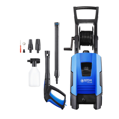 Die Nilfisk MC 2C Kaltwasser-Hochdruckreiniger sind vielseitige, kompakte und leistungsstarke Geräte der Einstiegsklasse für unterschiedlichste Reinigungsaufgaben. Dank zahlreicher Ausstattungsmerkmale und Einstellmöglichkeiten lassen sich die Maschinen flexibel an kleinere tägliche oder wöchentliche Reinigungsanforderungen anpassen. Die Automatik Start/Stopp-Funktion spart Energie, verlängert die Produktlebensdauer und verhindert störende Maschinengeräusche während Arbeitspausen. Die Ergo 2000 Pistole in Verbindung mit dem Ergo Zubehörkonzept ermöglicht eine einfache und komfortable Bedienung und reduziert die Belastung für den Anwender. Das Universal Plus Strahlrohr mit 4-in-1-Düse vereint Hochdruck 20°, Hochdruck 65°, Niederdruck und Turbohammer in einem Strahlrohr und erlaubt durch einfaches Verdrehen des Düsenkopfs stets die passende Einstellung für nahezu alle Reinigungsaufgaben. Eine integrierte Schlauchtrommel mit Schlauchführung sorgt für leichtes Auf- und Abrollen sowie sichere Aufbewahrung des stahlarmierten, besonders strapazierfähigen und flexiblen Schlauchs. Der Schaumsprüher mit 2,5-Liter-Kanister ermöglicht eine einfache und ressourcenschonende Reinigungsmittelanwendung für überzeugende Reinigungsergebnisse. Ergänzt wird die Ausstattung durch eine Wassermengenregulierung zur Anpassung von Druck und Wassermenge, einen drehbaren Kabelhaken für schnelles Auf- und Abwickeln des Netzkabels sowie einen Teleskopgriff für leichten Transport und platzsparende Aufbewahrung.