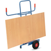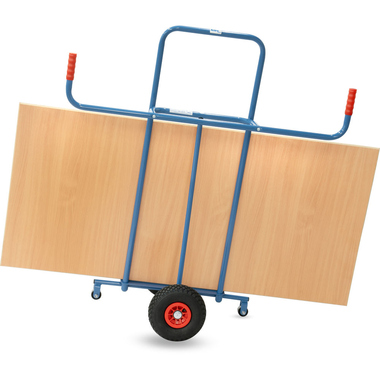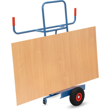 Plattenkarre in Stahlrohrkonstruktion mit Stahlblechschaufel. Naben mit Rollenlager. 2 Stützrollen 50 mm Ø. Zum Längstransport von großflächigen Holz- und Kunststoffplatten.