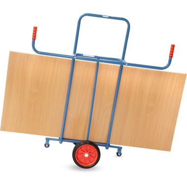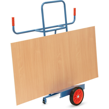 Plattenkarre in Stahlrohrkonstruktion mit Stahlblechschaufel. Räder mit Vollgummi-Bereifung. Naben mit Rollenlager. 2 Stützrollen 50 mm Ø. Zum Längstransport von großflächigen Holz- und Kunststoffplatten.