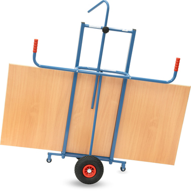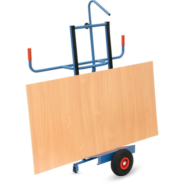 Stahlrohr-Konstruktion mit Stahlblechschaufel, Anlagen mit Profilgummi belegt (rutschsicher), und einstellbarem Niederhalter als Kippsicherung. Räder mit Luftbereifung. Naben mit Rollenlager. 2 Stützrollen 50 mm Ø. Zerlegte Anlieferung. Zum Längstransport von großflächigen Holz- und Kunststoffplatten.