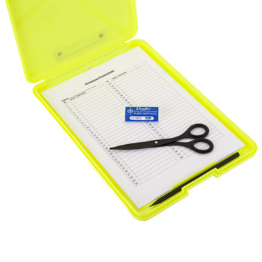 Das Safety Klemmbrett ist besonders flach und so sehr handlich. Das nach oben zu öffnende Innenfach schützt Unterlagen vor Nässe, Staub und Schmutz. Die Produkte der neuen Safety-Serie erzeugen mit ihren Signalfarben Aufmerksamkeit. Der Edelstahlclip auf der Oberseite fixiert Unterlagen sicher und erleichtert die Arbeit.