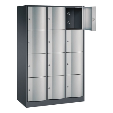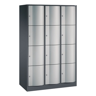 Stahl-Schließfachschrank Resisto. Korpus aus stabiler Stahlkonstruktion mit hochwertiger Einbrennbeschichtung für hohe UV- und Korrosionsbeständigkeit. Spezialtüren aus 1,5 mm Stahl, mit Wölbung nach vorne, absolut stabil und vandalismussicher, mit Anschlagsdämpfer. Türaufhängung durchgängig mit robustem Drehstangen-Scharnier, rechts angeschlagen. Rückwand mit großflächigem Luftdurchlass und 18 mm Wandabstandshaltern. Auf 100 mm hohem Sockel mit 30 mm Niveauregulierung. Schließkreis bis 6000 verschiedene Schließungen. Achtung: Anlieferungsmöglichkeit durch Sattelschlepper muss gegeben sein.