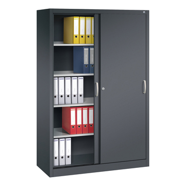 Stahl-Schiebetürenschrank Acurado-2000. Korpus aus stabiler Stahlkonstruktion mit hochwertiger Einbrennbeschichtung für hohe UV-Beständigkeit. Mit Kunststoffgleitern als praktischem Schrank- und Fußbodenschutz. Hohe Flexibilität der Inneneinrichtung durch Höhenverstellbarkeit im Raster. Türen verstärkt für hohe Stabilität. Leichtgängige Bedienung durch Leichtlaufrollen in spezieller Schienenführung. 2 ergonomische Bügelgriffe Ergolock aus Metall für einfache Bedienung, matt vernickelt. Achtung: Anlieferungsmöglichkeit durch Sattelschlepper muss gegeben sein.