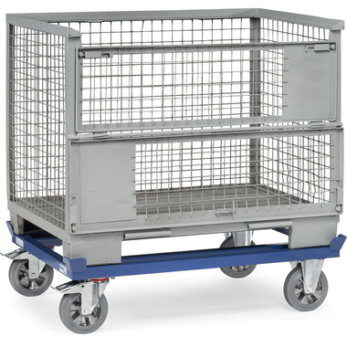 Robuste Schweißkonstruktion, mit 4 Fangecken. Mit 2 Lenk- und 2 Bockrollen. Naben mit Kugellager, blaugrau "spurlos", Feststeller an den Lenkrollen, gemäß der europäischen Norm EN 1757-3 (Sicherheit von Plattformwagen). Geringer Rollwiderstand, elastischer Lauf, keine Fahrgeräusche.