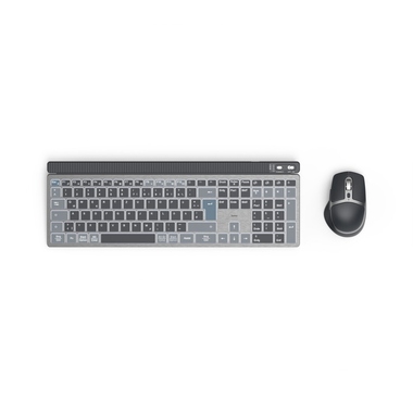 Die Multi-Device-Tastatur mit Maus verfügt über 1 Funk- und 2 Bluetooth-Kanäle und lässt sich so mit bis zu 3 Endgeräten gleichzeitig verbinden - per Tastendruck blitzschnell wechseln. Langlebige und robuste Scissortasten: ideal für intuitives, flüssiges und geräuscharmes Tippen selbst bei sehr hoher Eingabegeschwindigkeit. Assist-Taste aktiviert den programmübergreifenden KI-Assistenten. Steuern der Multimediafunktionen über die Zweitbelegung der F-Tasten - ohne den umständlichen Weg über die Systemeinstellungen gehen zu müssen. Ganz einfach FN-Lock aktivieren und deaktivieren: tauscht die Erst- und Zweitbelegung der Tasten F1 bis F12 - so können Sie z.B. direkt die Multimedia-Funktionen über die F-Tasten nutzen, ohne jeweils zusätzlich die Fn-Taste gedrückt zu halten. Die Lichtstärke der beleuchteten Tastatur ist dimmbar und sorgt für ein optimales Handling im Dunkeln. Die klappbaren Standfüße ermöglichen drei verstellbare Tippwinkel für ein rutschfestes und bequemes Arbeiten an der schnurlosen Tastatur. Die kabellose Tastatur verschlüsselt sämtliche Tastenanschläge nach dem Verschlüsselungsstandard AES-128. Edle Optik und modernes Design dank hochwertiger und robuster Komponenten aus Aluminium. Die kabellose Maus schmiegt sich durch ihre ergonomische Form perfekt in die Rechtshänder-Hand für komfortable Arbeitsbedingungen. Der Blue-Wave-Sensor ermöglicht die Benutzung der optischen Maus auf beinahe allen Oberflächen. Leise Maus ohne Klickgeräusch: flüsterleise Tasten ermöglichen störungsfreies und entspanntes Arbeiten mit der Wireless-Maus. Die Browser-Tasten der kabellosen Maus unterstützen die Vor-/Zurück-Funktion zum einfachen Navigieren, z.B. für Internet-Browsers, Outlook etc. Der verstaubare USB-Empfänger kann platzsparend wahlweise im Tastatur- oder Mausgehäuse transportiert werden. Dieses Produkt besteht zu mindestens 20 % aus recycelten Materialien - so nehmen wir an einem umweltfreundlichen Kreislauf teil.